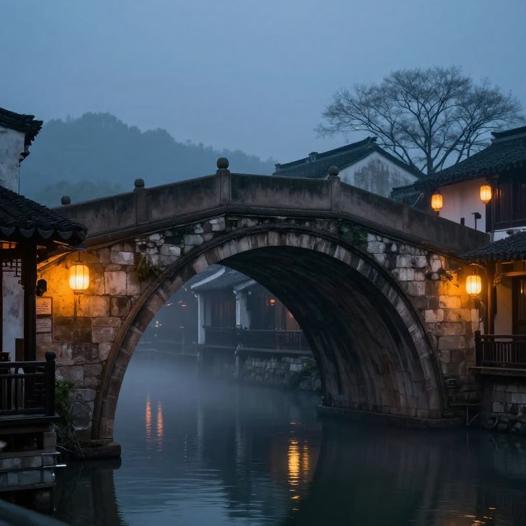 Photograph of a tranquil, misty night scene featuring a stone arch bridge over a calm, reflective river. The bridge is illuminated by warm, yellow lanterns on either side, casting a soft glow. Traditional Asian-style buildings with tiled roofs are visible on either side of the bridge. In the background, bare trees and mist-covered hills create a serene atmosphere. The colors are predominantly cool blues and grays, with the warm yellow lanterns providing contrast. The image evokes a peaceful, timeless quality.