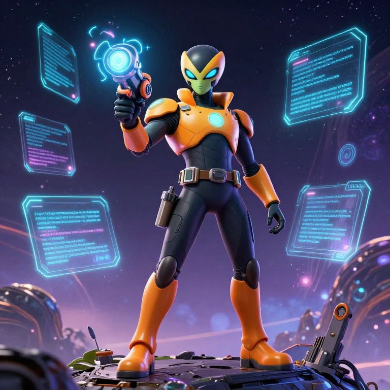 Ben 10 standing atop a futuristic alien planet, wearing his signature suit, with a glowing alien weapon in hand, surrounded by floating holographic texts and cosmic energy, detailed and immersive, Flux-style.
