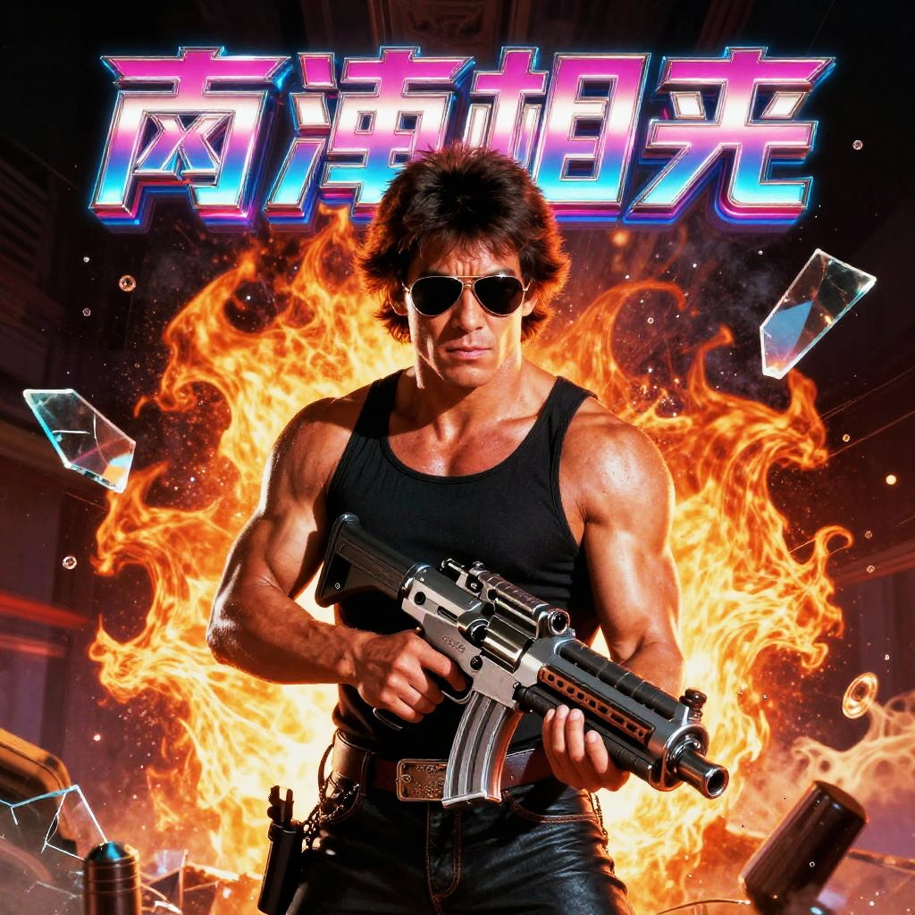 Movie poster generator designed for a retro 80s action movie, explosive background with flames and shattered glass, muscular protagonist with aviator sunglasses holding a futuristic weapon, neon colored fonts with chrome effect, dynamic composition and high contrast shadows