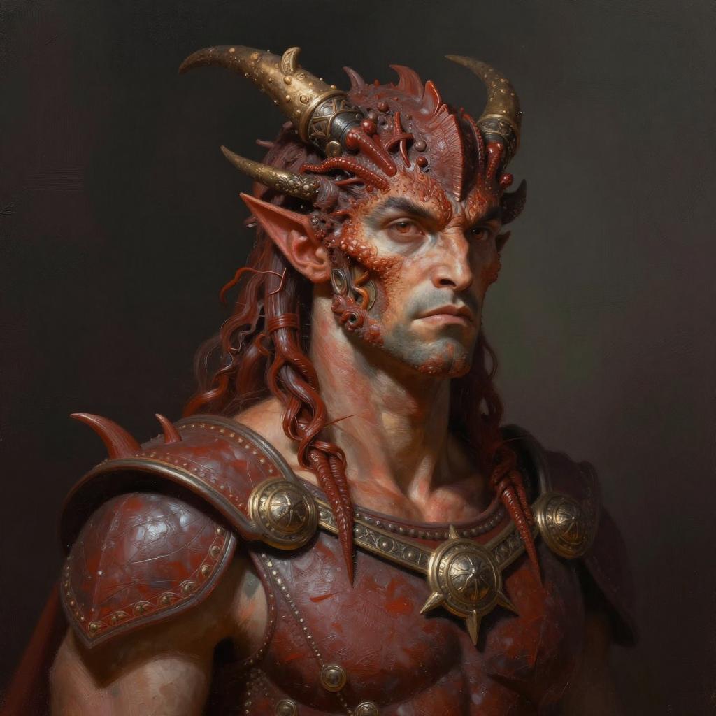 Portrait of a Ancient Greek Medium carmine Dragonborn_Person, Fantasy, realistic, Volumetric lighting, concept art, matte, brush stroke style, artstation, trending, highly detailed, art by greg rutkowski.