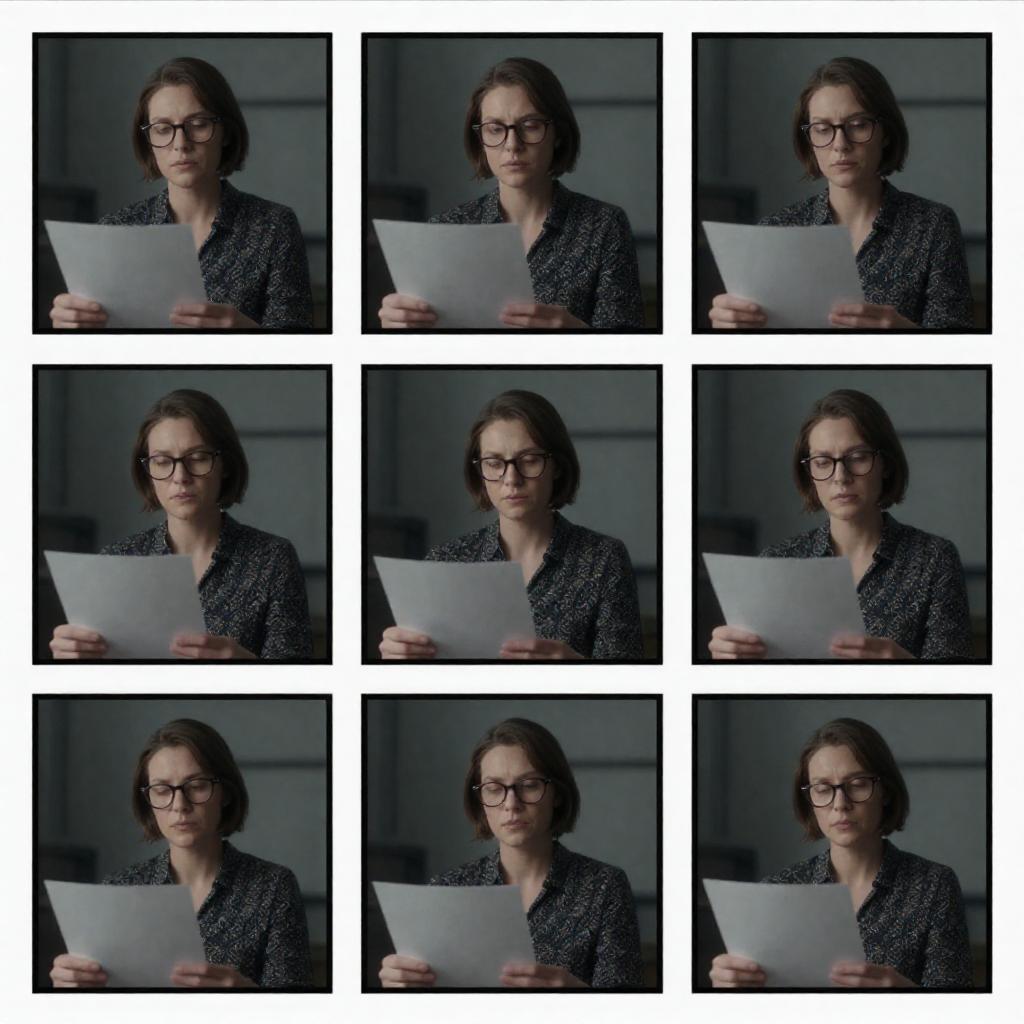 Photograph of a woman with short brown hair, glasses, and a dark, patterned blouse in six separate TV monitor frames. She holds papers and looks at them with a serious expression. Backgrounds show industrial settings with dim lighting. Five additional frames show her from different angles. She wears glasses and has a focused look in most frames.