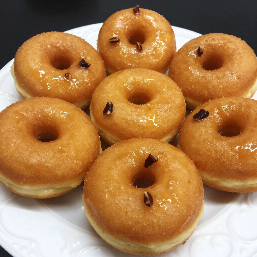 Close-up photo of a plate filled with golden-brown, glossy, sugar-coated donuts with small dark brown nuts on top. The donuts have a shiny, sticky texture and are arranged closely together on a white, ornate-patterned plate. The background is a dark, out-of-focus surface that contrasts with the bright donuts. The image has a casual, appetizing feel.