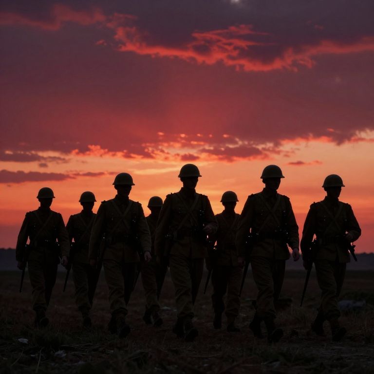 Under a blood-red twilight sky, soldiers march forward into the echoes of their past, their silhouettes etched against the fiery horizon, embodying the haunting duality of memory and fate.