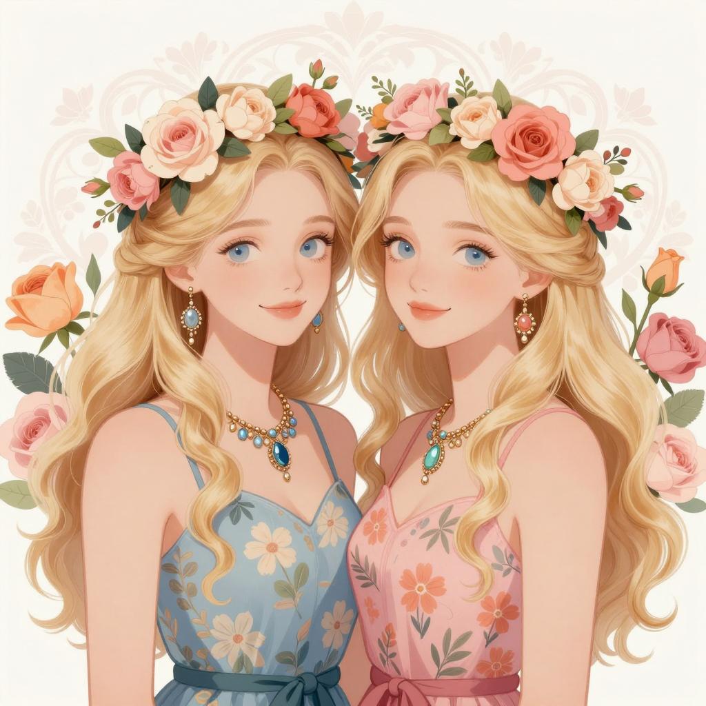Illustration of two young women with fair skin, blonde hair, and blue eyes. Both wear flower crowns with pink, orange, and white flowers. The woman on the left has her hair partially covered, wears a colorful embroidered blouse and red skirt. The woman on the right has her hair in a long braid, wears a white blouse with pink embroidery and a red sash. Their hands are intertwined in front of their chests. Both have neutral expressions. Background is a light, blurred gradient.