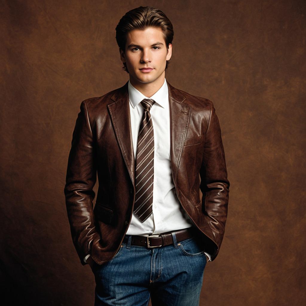 Leather blazer man,solo, 1boy, male focus, necktie, realistic, pants, jacket, shirt, suit, formal, denim, jeans, white shirt, brown jacket, collared shirt, brown hair, looking at viewer, brown background, standing