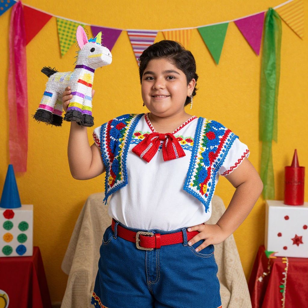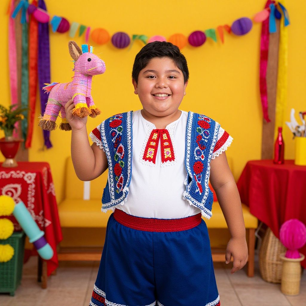Obese Mexican kid enjoying a festive celebration, surrounded by piñatas and decorations, bright colors, detailed traditional attire, happy mood, rich cultural environment