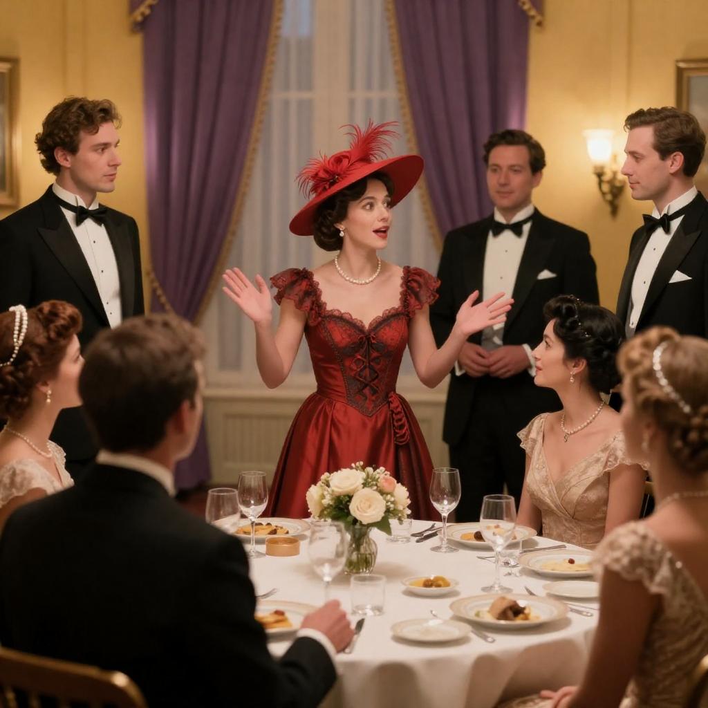 Photograph of a vintage movie scene with a grand, classical-style porch. A woman in a yellow gown stands center, facing a seated man in a blue shirt and black pants. Surrounding them are various people in period clothing, some standing, some seated. The background features tall columns and green curtains.