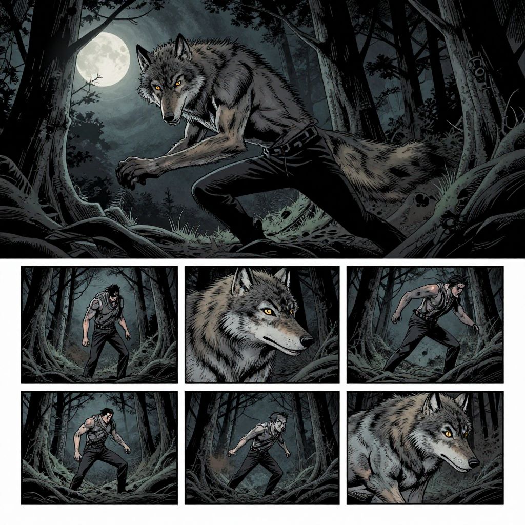 Transformation comic exploring werewolf theme, dark moonlit forest, gradual shift from human to wolf form, gritty textures, moody atmosphere, suspenseful sequential art style
