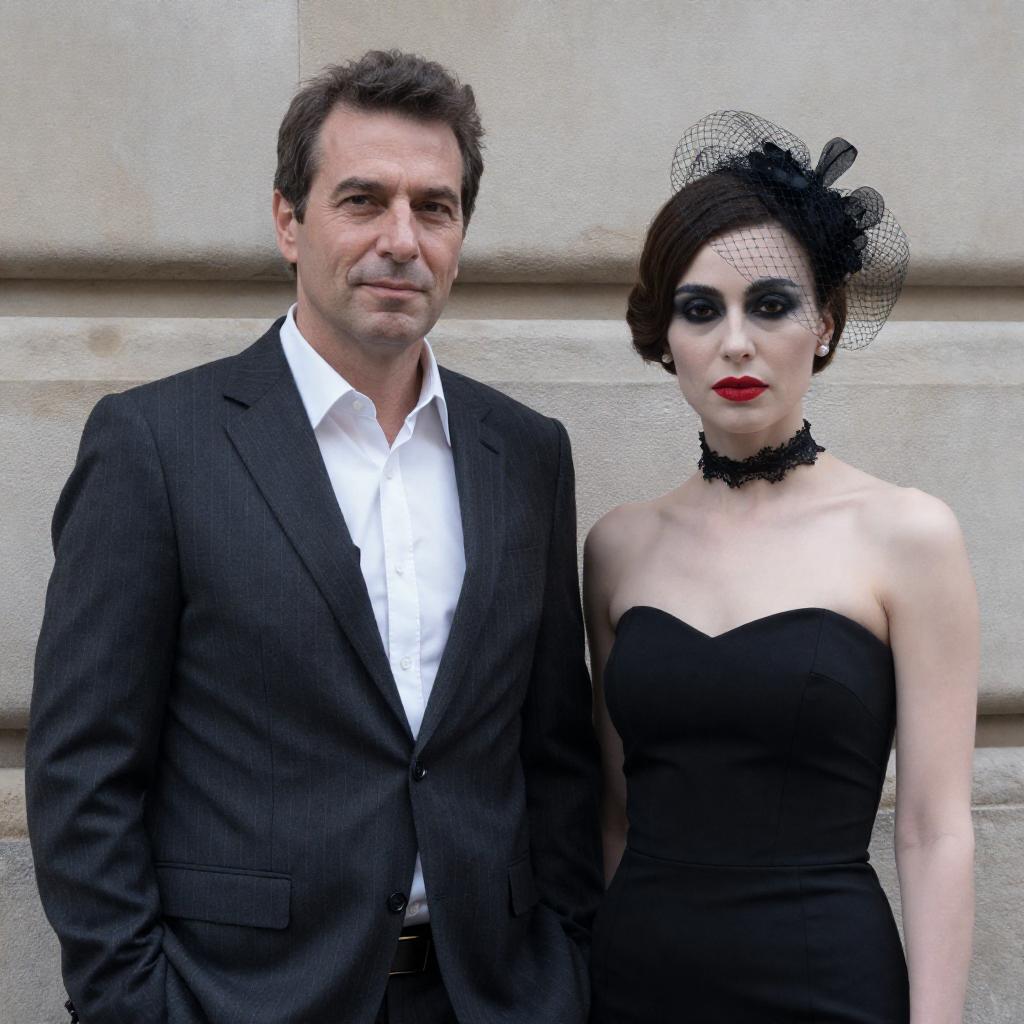 Photograph of a middle-aged man with dark hair in a pinstripe suit and white shirt, standing beside a woman with pale skin, red lipstick, and black eye makeup. She wears a black lace choker, black dress, and a black netted hat. They stand against a stone wall, with the man on the left and the woman on the right.