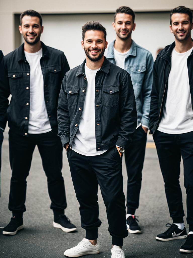 Joggers business casual, jacket, blurry, shirt, pants, blurry background, white shirt, multiple boys, male focus, hands in pockets, shoes, sneakers, black jacket, realistic, solo focus, open jacket, looking at viewer, full body, black pants, open clothes, standing, denim, short hair, smile