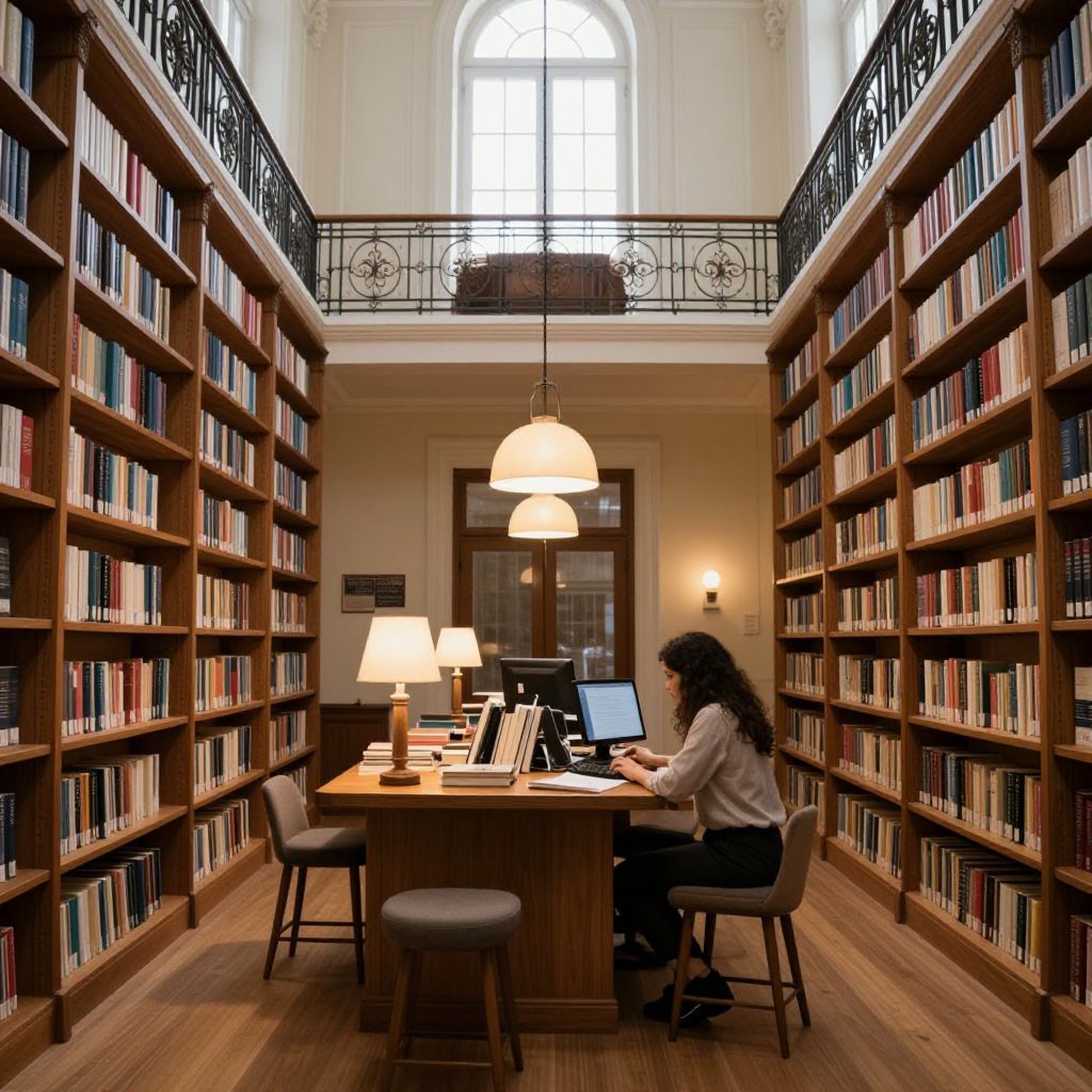 Photograph of a quiet library with tall wooden bookshelves filled with colorful books on both sides. At the center, a woman with curly black hair, wearing a white blouse and black pants, sits at a wooden desk, typing on a laptop. Two table lamps with white shades and a modern hanging light fixture illuminate the desk. An upholstered stool is positioned in front of the desk. The background features a balcony with black iron railings and large arched windows. The floor is wooden, adding warmth to the elegant, academic setting.