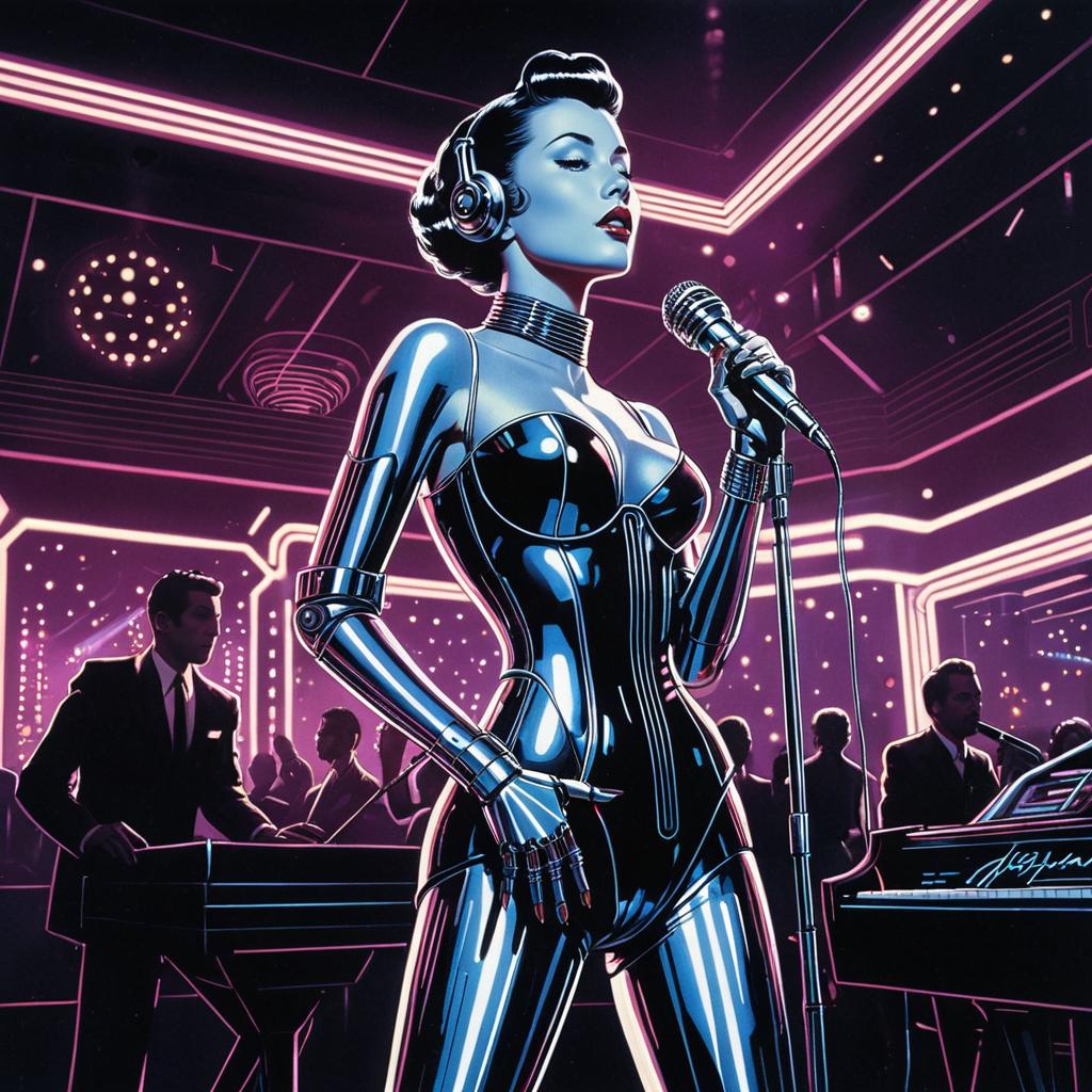 Illustration of a glamorous robotic jazz singer in retro-futuristic style inspired by Hajime Sorayama. The female robot features a shiny metallic body and is holding a microphone in a soulful pose. The background showcases a smoky nightclub interior with neon lights and musicians playing keyboard and piano, enhancing the sci-fi glamour atmosphere.