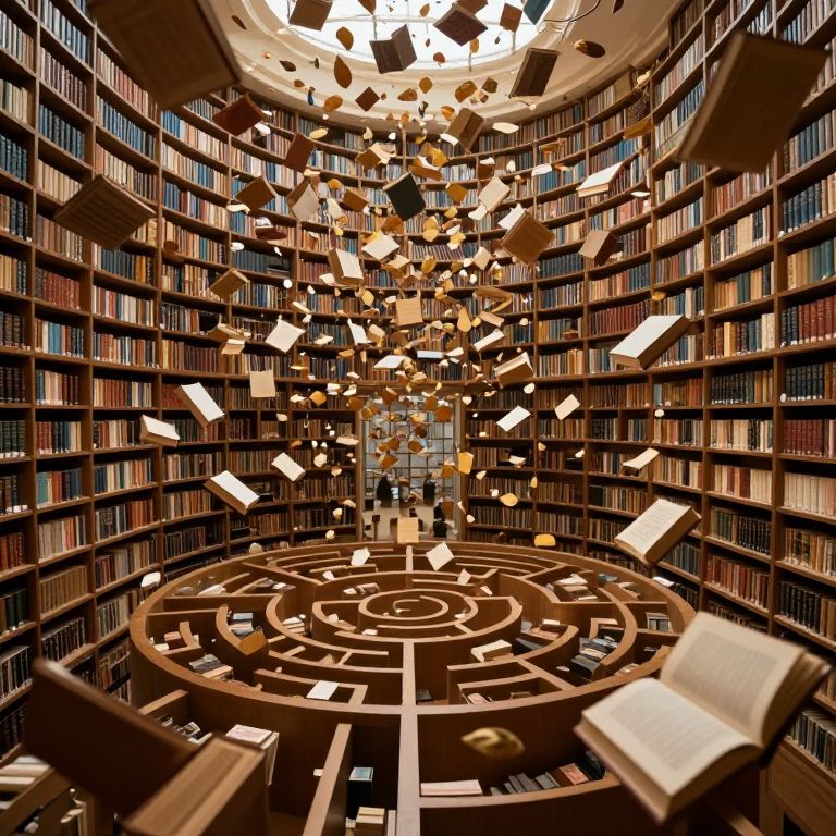 This digital illustration depicts a grand, circular library with tall, wooden bookshelves filled with colorful books lining the walls. At the center is a large, circular, labyrinth-like wooden table. Floating above the table are numerous books and papers, seemingly levitating in mid-air. The ceiling has a dynamic, fragmented design with light streaming through, creating a dramatic, almost magical atmosphere. The colors are warm and rich, with the wooden shelves and table contrasting against the bright, floating objects. The overall style is surreal and whimsical, blending realism with fantasy elements.