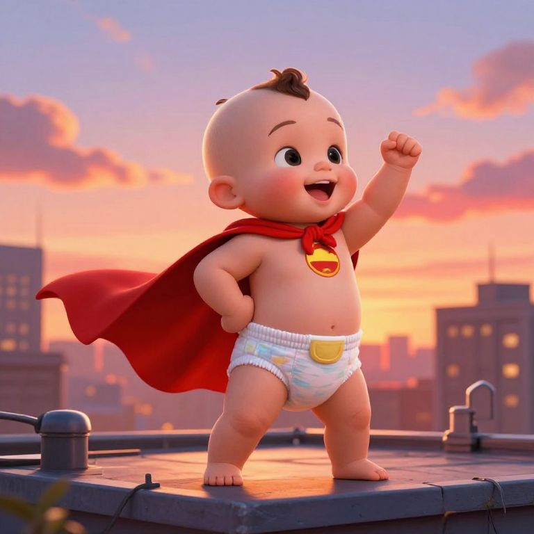 Diaper Joe, a whimsical scene of a baby superhero named Diaper Joe, wearing a cape and a diaper, standing confidently on a city rooftop at sunset, vibrant sky and dynamic pose, heroic and imaginative digital painting.