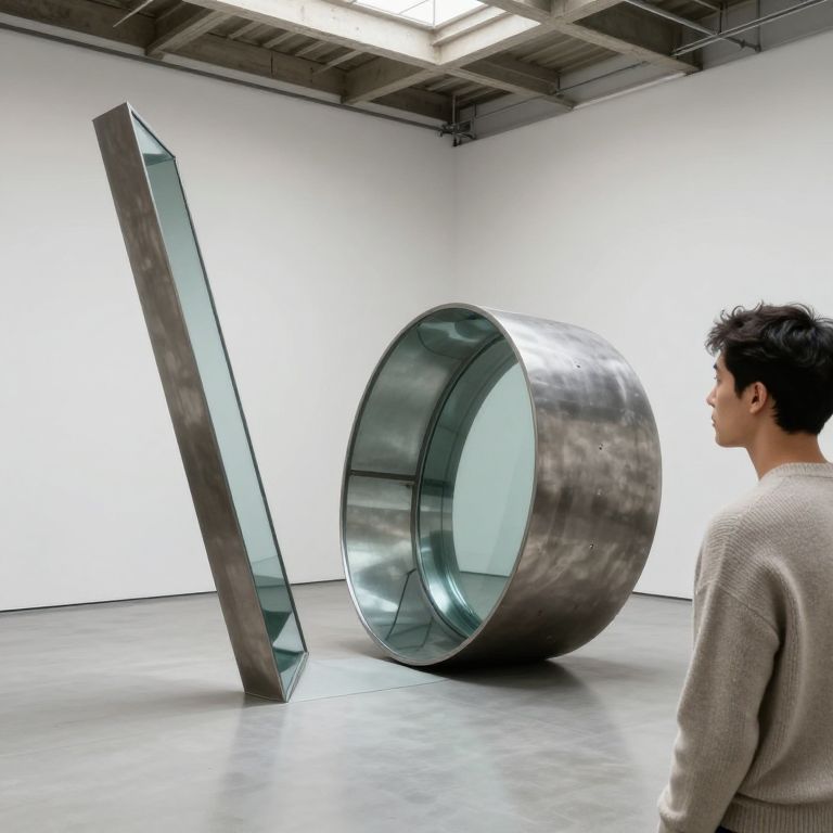 A dramatic architectural interior shot of a modern loft, where a sculpture made of steel and glass has an off-center exaggerated proportion—its left side is long and narrow, while the right side is wide and bulging, forming an intentional visual imbalance—set beside a person wearing a neutral sweater, facing the sculpture with a neutral expression, mid-attention.
