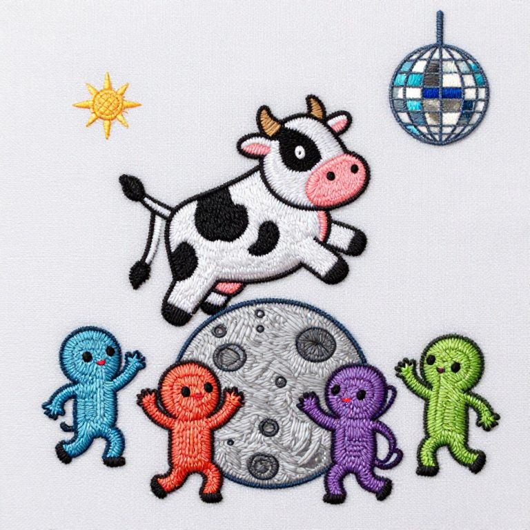 Embroidery Project a cow high jumping on the moon with aliens dancing the griddy and a disco ball in background- cartoon style,