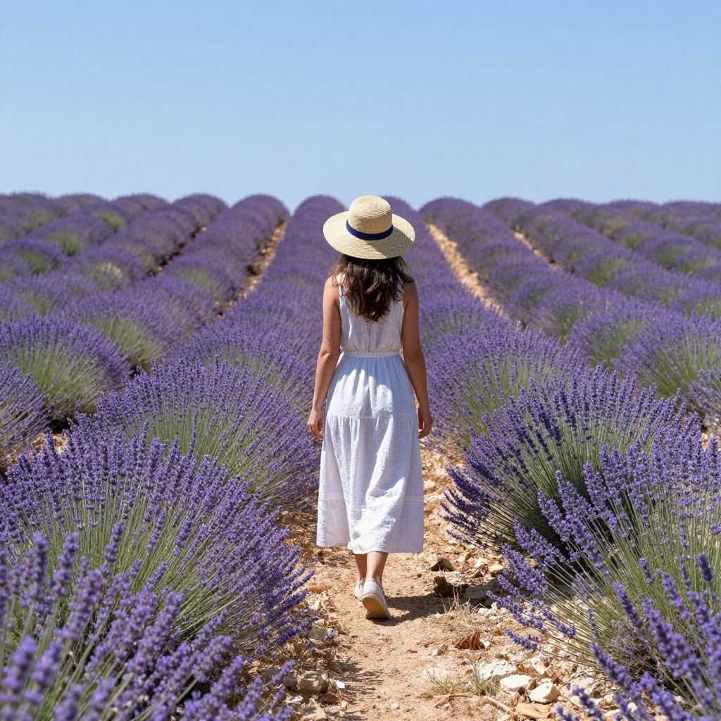 Woman strolling through rows of vibrant lavender fields in Provence, France, her back turned as she walks along a dirt path surrounded by lush purple blooms under a clear blue sky.