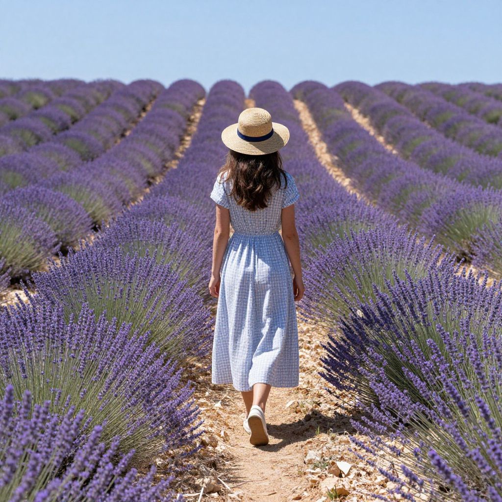 Photograph of a woman in a blue checkered dress and straw hat walking through vibrant, purple lavender fields under a clear blue sky.