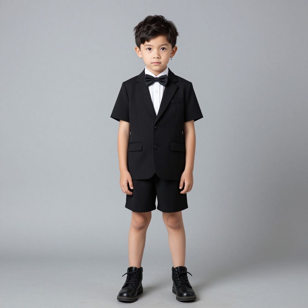 Photograph of a young Asian boy standing against a plain, light gray background. He has short, dark, slightly tousled hair and a serious expression. He is wearing a black short-sleeved suit jacket with a white dress shirt and black bow tie, black shorts, and black lace-up shoes. His arms hang by his sides and his legs are slightly apart. The overall appearance is formal and poised, with a minimalist, studio-like setting that emphasizes the boy's attire and expression.