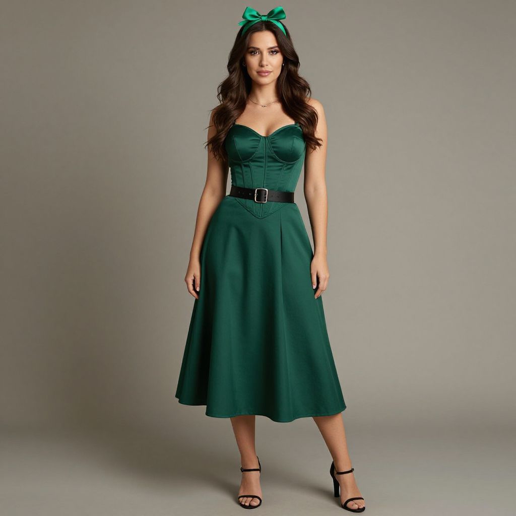 Woman with long brown hair, wearing a green corset and a green skirt with a black belt. She has a green headband with a green bow on her head, and is wearing black sandals on her feet.