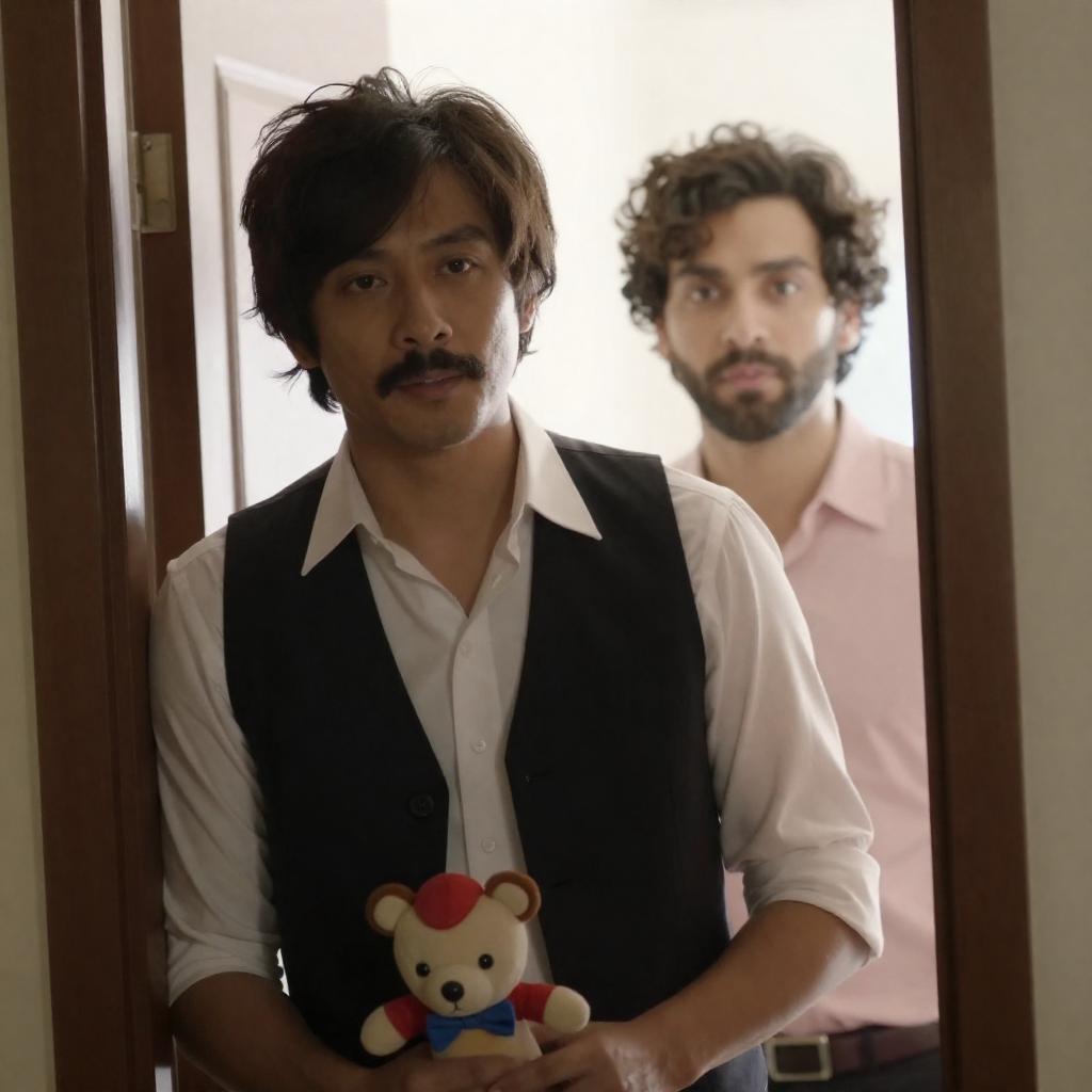 Photograph of two men in a doorway. The man in the foreground has dark, wavy hair, a mustache, and wears a white shirt with a black vest, holding a small stuffed toy with red and blue accents. The man in the background has curly hair, a beard, and wears a pink shirt. Bright light from behind them illuminates the scene.