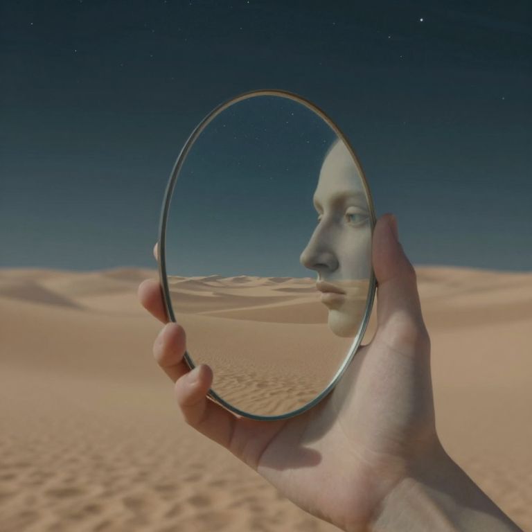 Photograph of a pale hand holding a circular mirror in a sandy desert under a starry night sky. The mirror reflects a white, androgynous, face with a calm expression, slightly tilted to the right. The desert sand has fine, rippled textures, and the sky transitions from dark blue at the top to black with scattered stars. The hand is centered in the foreground, contrasting with the expansive, empty desert background. The mirror is smooth and metallic, capturing the face with sharp clarity.