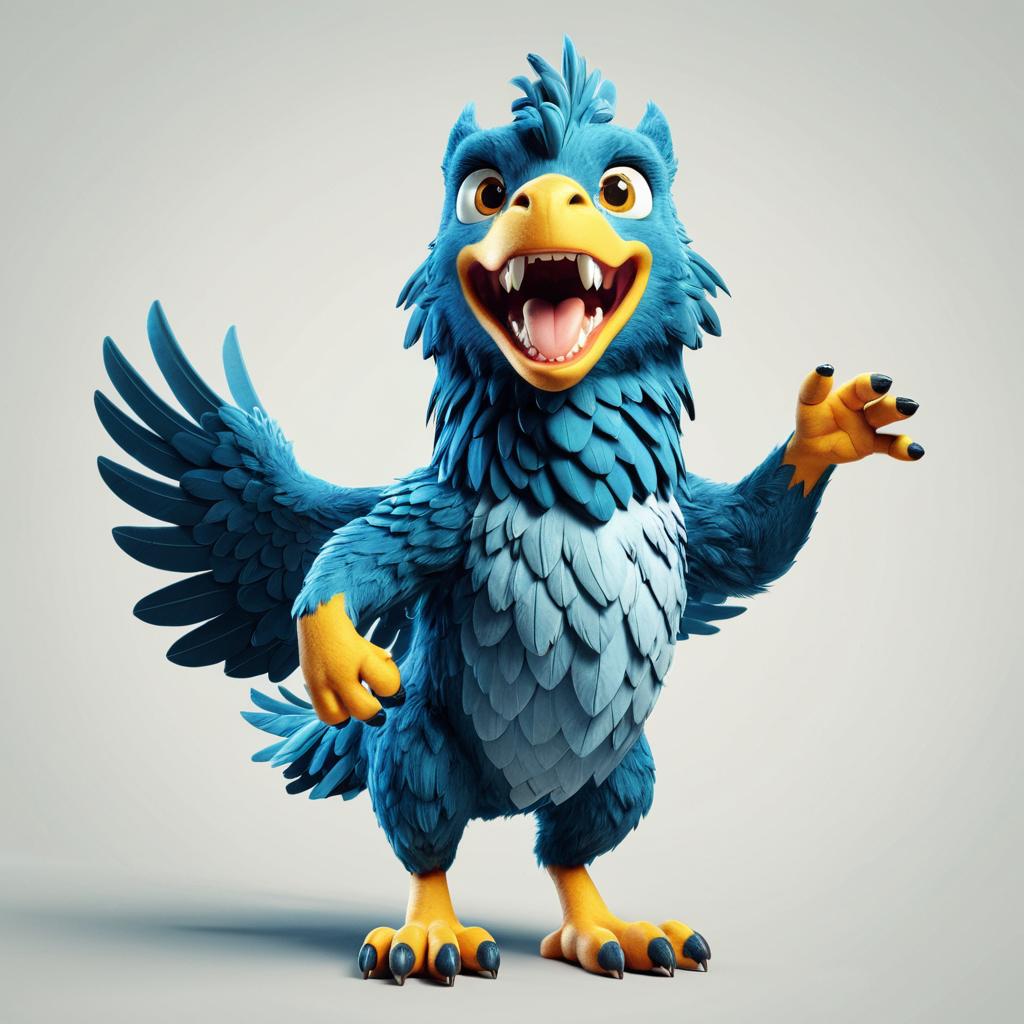 A 2D digital illustration of a cute blue parrot character, inspired by Rio characters. This trendy and iconic design features detailed feathers, bright orange beak and feet, and expressive large eyes. The parrot stands on a white background, rendered with clean, sharp details and a full-body emoticon style, ideal for character branding or illustration.