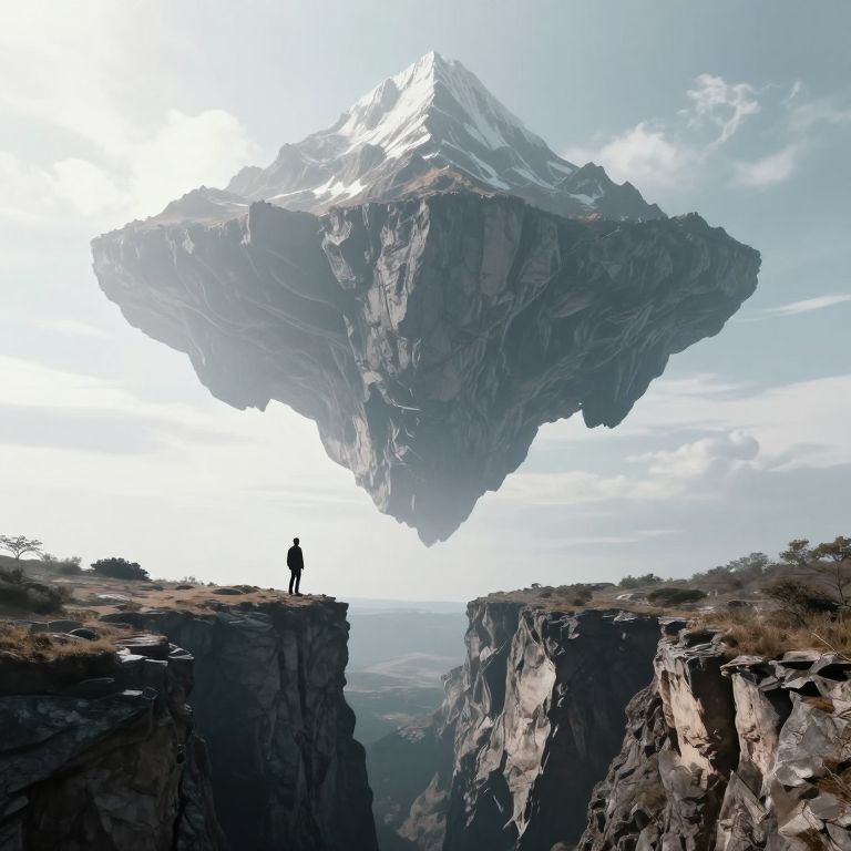 A solitary figure stands at the edge of a vast chasm, gazing up at a colossal, inverted mountain suspended defying gravity, its peak piercing the ethereal sky above while its base hovers ominously over the abyss below.