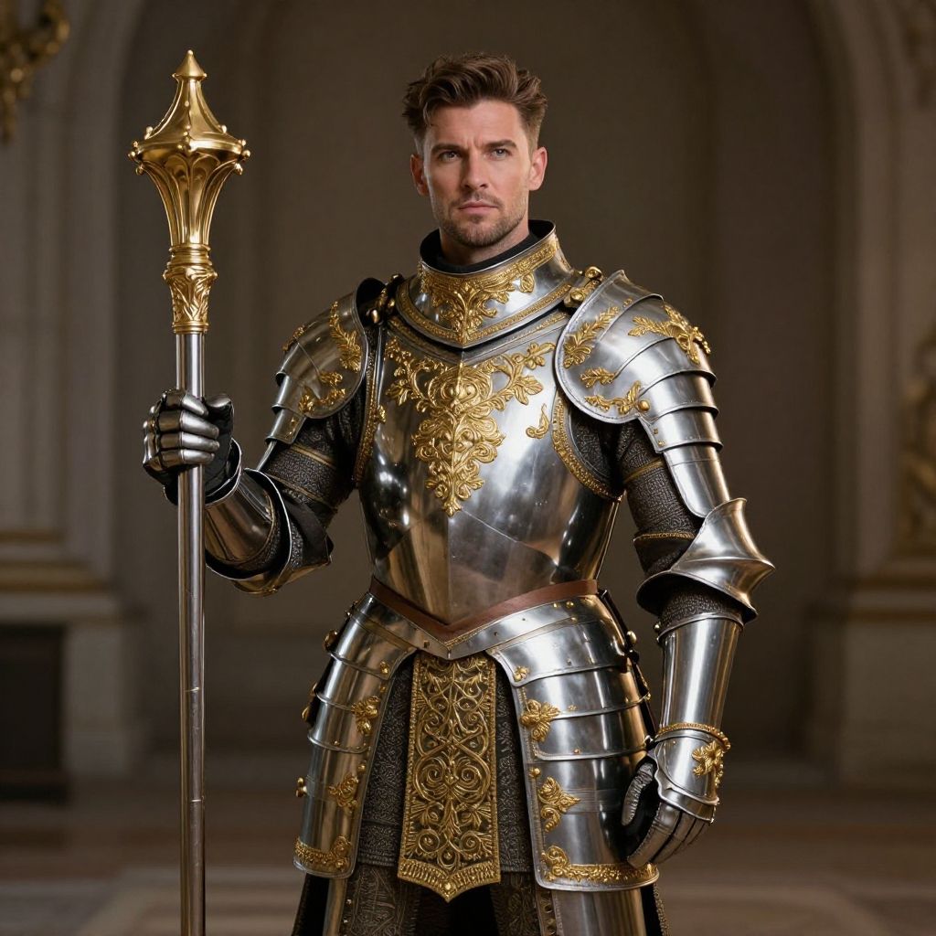 A confident man dressed in ornate, shining silver and gold medieval armor stands poised with a ceremonial staff. The detailed armor features intricate gold embellishments, reflecting a regal and powerful presence against a softly lit, moody background.