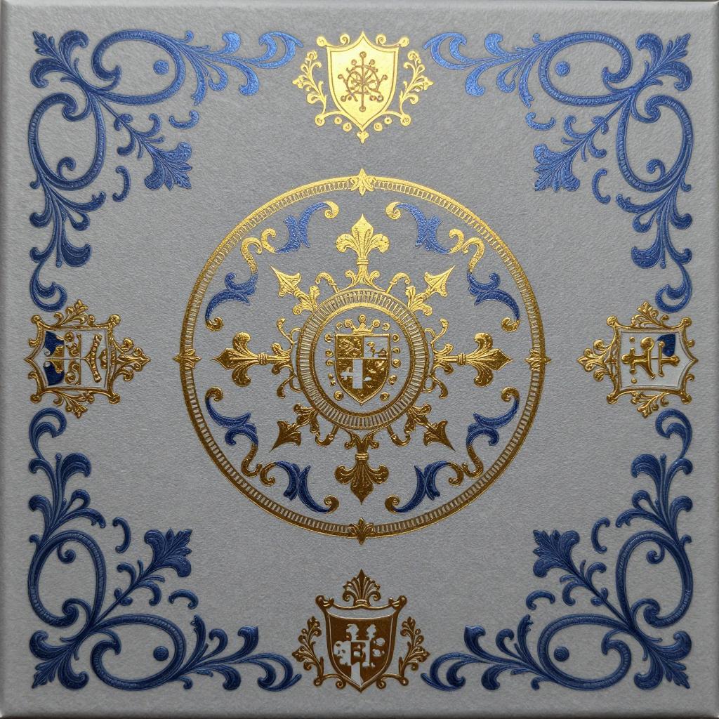 Scrollworks pattern featuring Heraldic scrollwork framing shields and crests in steel blue scrollwork on foggy grey arranged as central circular medallion of scrollwork on a plain field on high-end packaging box or perfume label rendered as gold foil stamping effect with subtle bevel, ultra-detailed, sharp ornamental design, high resolution, intricate decorative pattern art