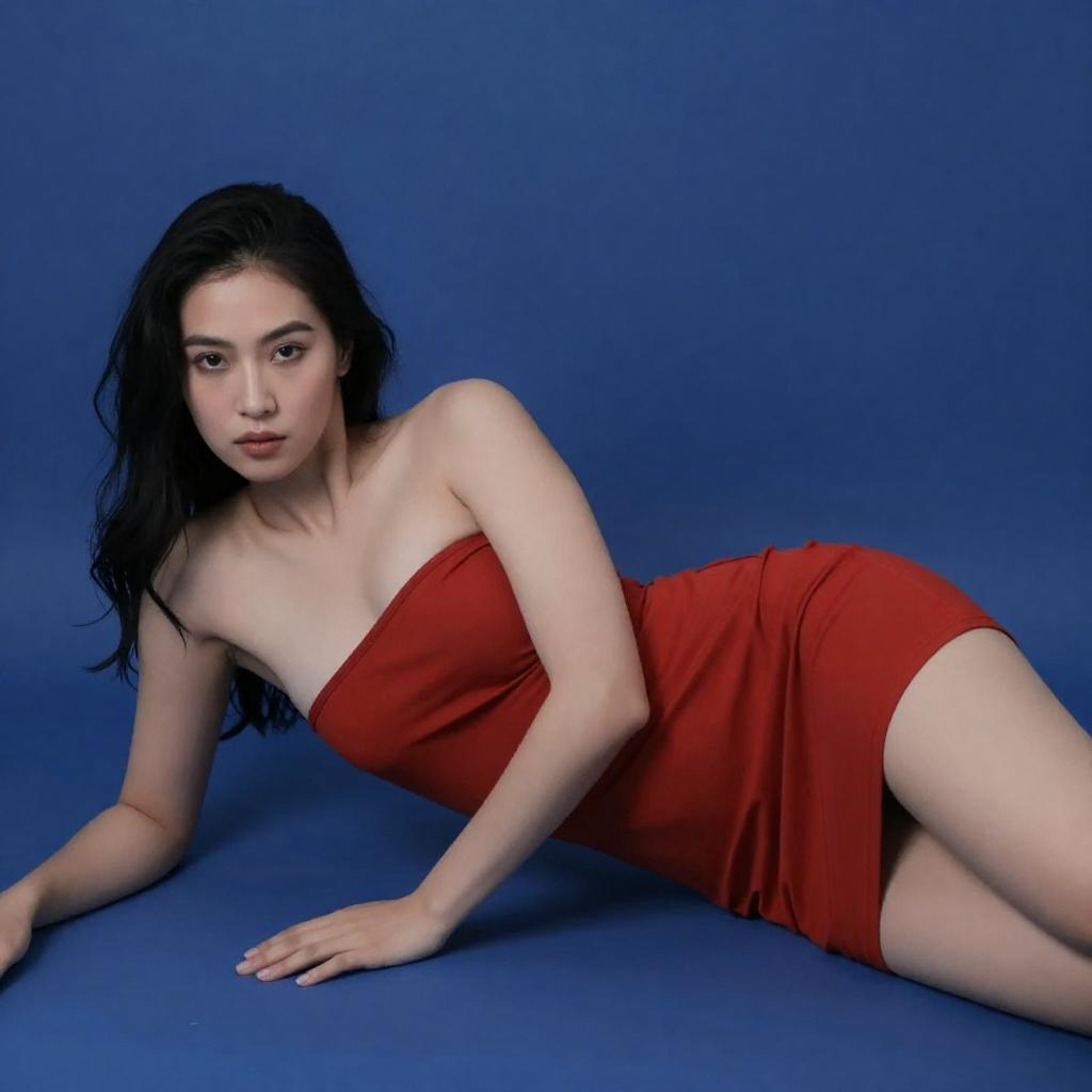 Photograph of a woman with dark hair, lying on her side on blue fabric. She wears a red, strapless dress, exposing her shoulders and legs. Her right arm rests on the fabric, left arm extends forward. Background is draped blue fabric. Her expression is neutral. One person.