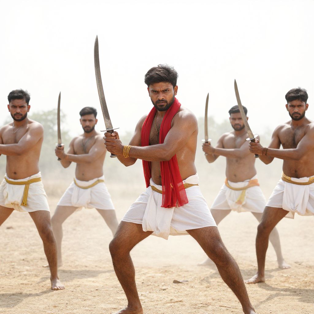 Photograph of five muscular, shirtless Indian men with dark skin, standing in a sandy, sunlit area. They are all wearing white dhotis with gold waistbands and holding curved swords. The central figure, with a red scarf around his neck, stands in a powerful stance with legs apart and sword raised. The background is blurred, highlighting the men. Their expressions are determined, and the overall scene has a warrior-like, dramatic quality. The men have short, dark hair and beards. The image has a high-contrast, vivid color palette.