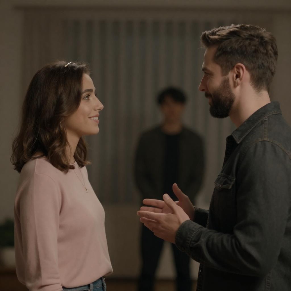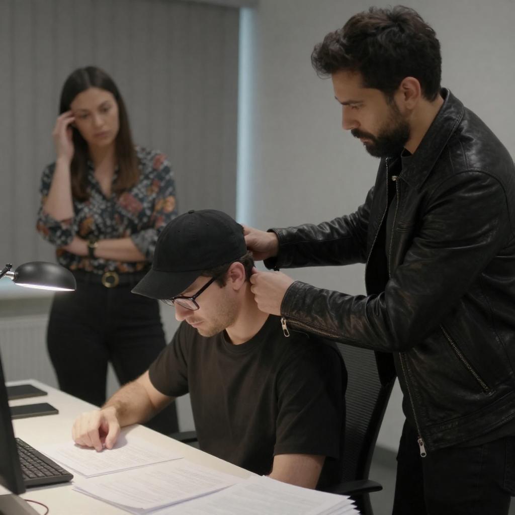 Photograph of a man with dark hair and beard, wearing a black leather jacket, forcefully pulling the head of another man in a black cap and glasses, who is seated at a desk with illuminated papers and a black lamp. A woman in a patterned shirt stands in the background, watching with her hand on her head. The setting is an indoor office with vertical blinds.