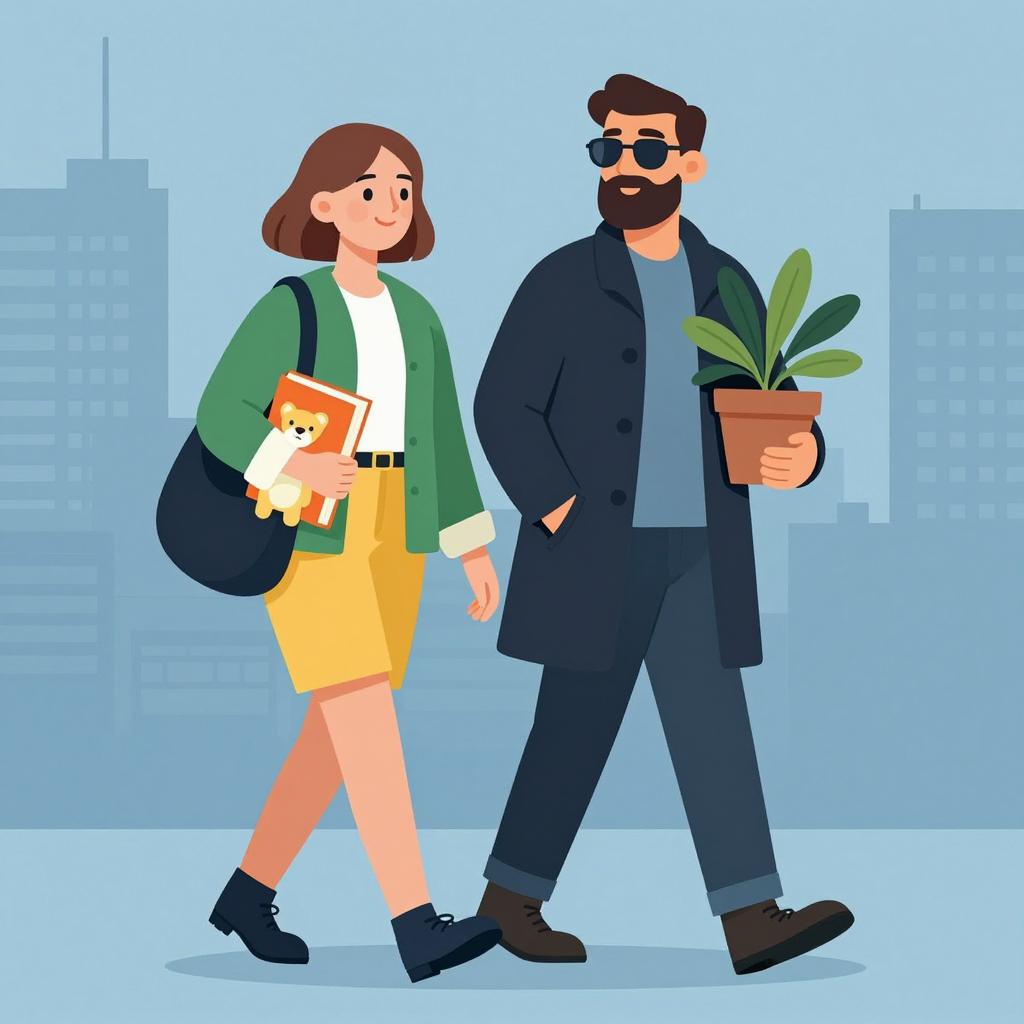 Illustration of two men. The left man wears a black bowler hat, dark sunglasses, white shirt, black vest, blue tie, beige pants, brown belt, and a yellow backpack. He adjusts his tie with his right hand. The right man wears a white shirt, brown belt, and glasses. He stands facing the left man. Light blue background. Both men have light skin and short hair. The left man has a neutral expression, while the right man's expression is slightly smiling. The left man looks down at the right man.