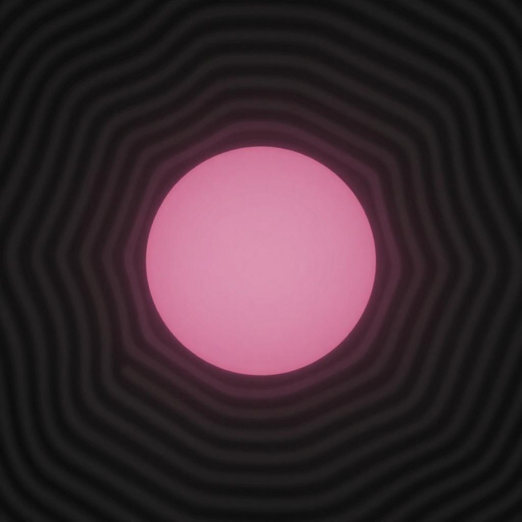 This digital artwork features a vibrant pink sun centered in a black, wavy, concentric patterned background. The waves create a hypnotic effect, with the pink sun casting a soft glow. The lighting is even, highlighting the intricate lines. The camera angle is straight-on, and the depth of field is shallow, keeping the sun in sharp focus while the background remains slightly blurred.