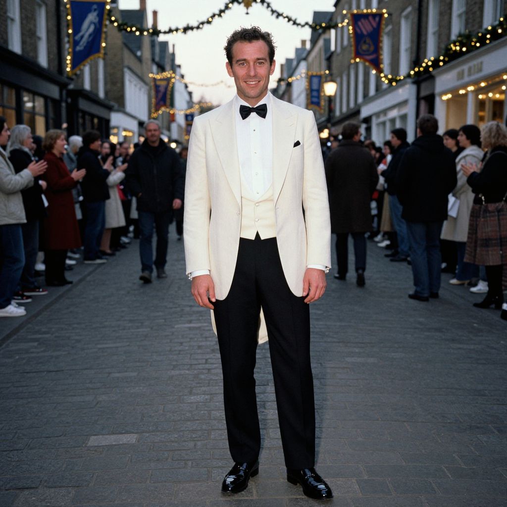 A man, ivory tailcoat, white dress shirt, pearl cufflinks, black silk bow tie, ivory waistcoat, black patent leather loafers, tailored black trousers, historic streets, cheering crowds, festive banners, twinkling lights, kodak sp analog photo, confident smile. Man has masculine face and piercing eyes