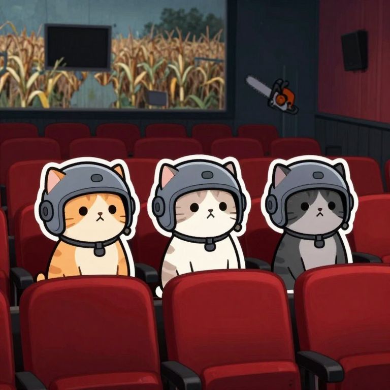 Cartoon cats in gray helmets sitting in red theater seats, watching a cornfield movie; one orange, one white, one gray. Digital art.