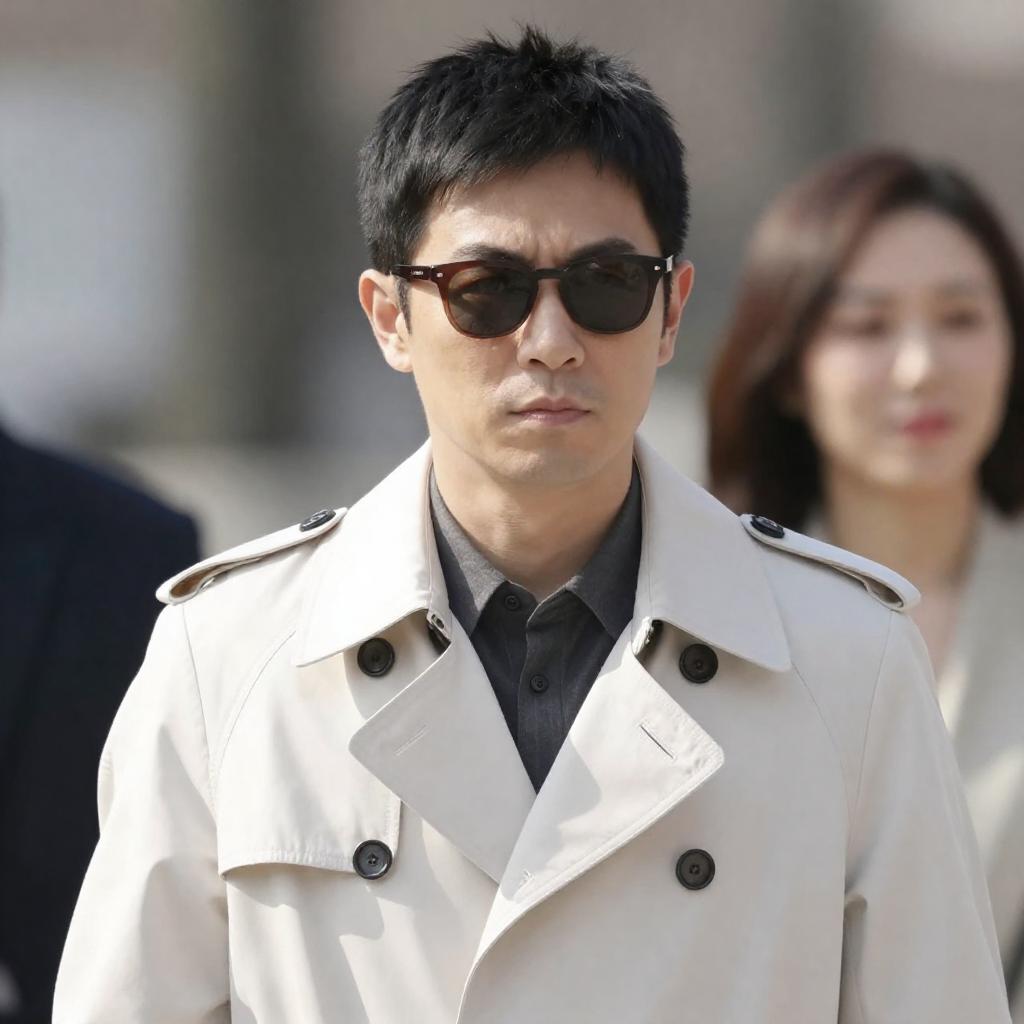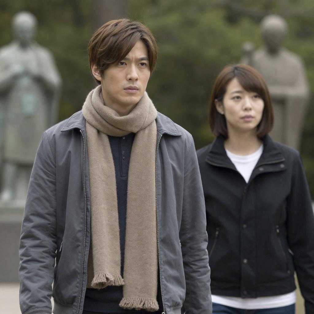 Photograph of two people walking in a forest. Man with medium-length brown hair, wearing a gray jacket and beige scarf, looks forward. Woman with short brown hair, wearing a black jacket over a white shirt, looks ahead. Background includes blurred statues and green trees. Man in the foreground, woman slightly behind and to the right. Both appear focused.