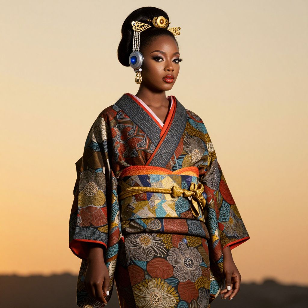 A beautifully detailed, high-fashion African woman in traditional Japanese attire, with intricate patterns and a futuristic, cyberpunk aesthetic, stands against a golden-hour background, exuding elegance and grace.