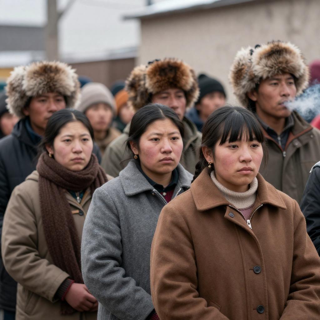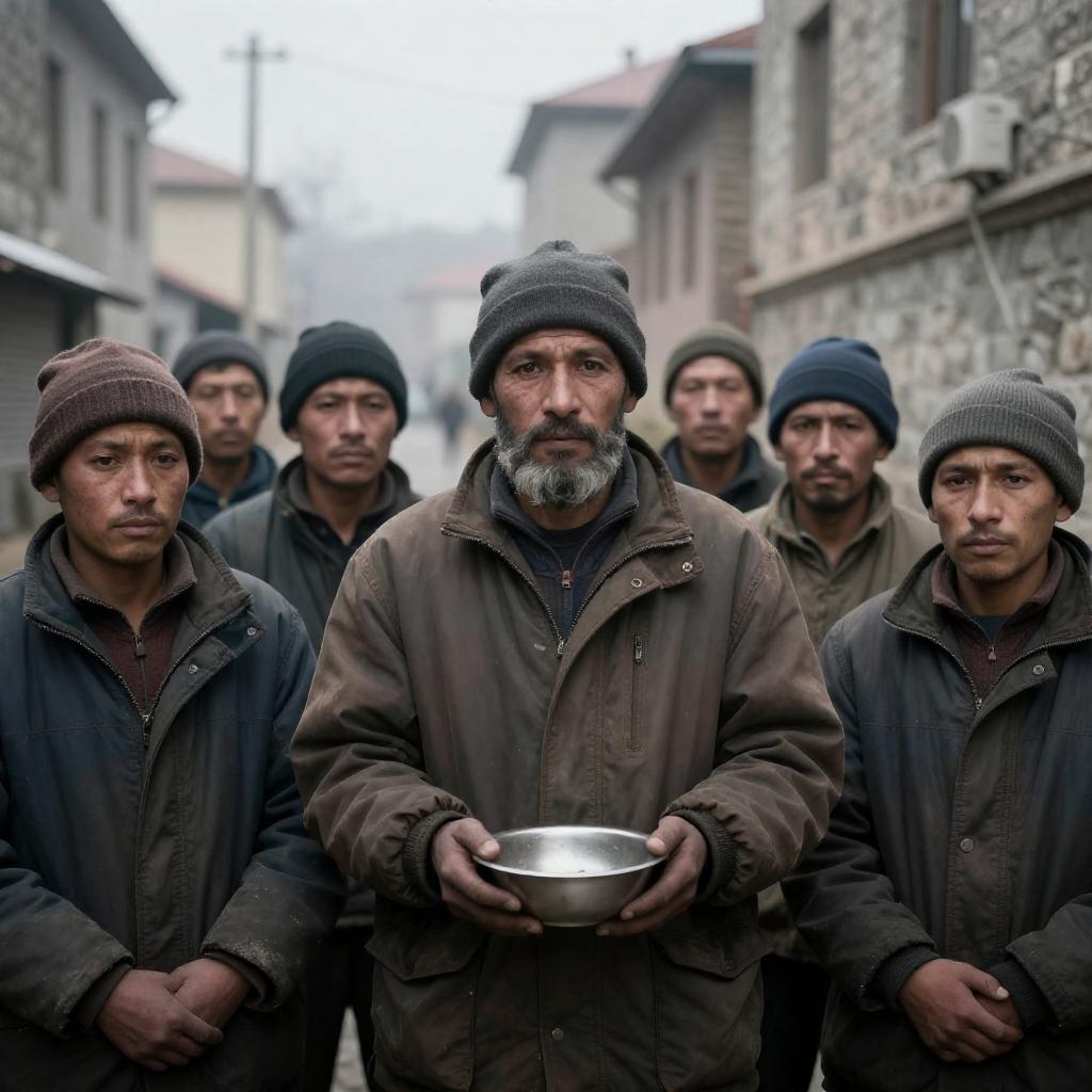 Group of poor people in worn clothing, hats, and coats, standing in a cold, urban outdoor setting. Central man with grey beard, brown jacket, and beanie holds bowl, looks forward. Background includes additional people, stone buildings, and overcast sky. Intense expressions visible. Six people in total, all focused on central man.