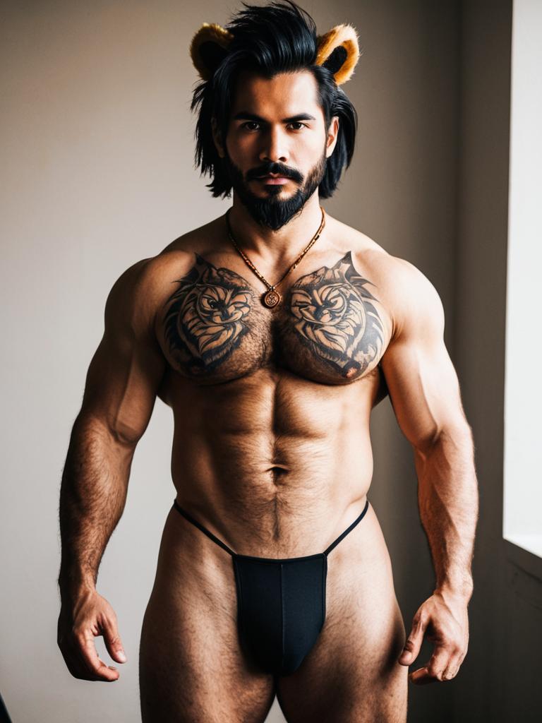 Photo of a mature muscular man wearing red lion ears costume accessory, black briefs, and a necklace. He has short black hair styled in an undercut with thick eyebrows and a full beard. His chest features a large, intricate black tattoo. The image shows a close-up view with warm natural lighting and a soft blurred background.