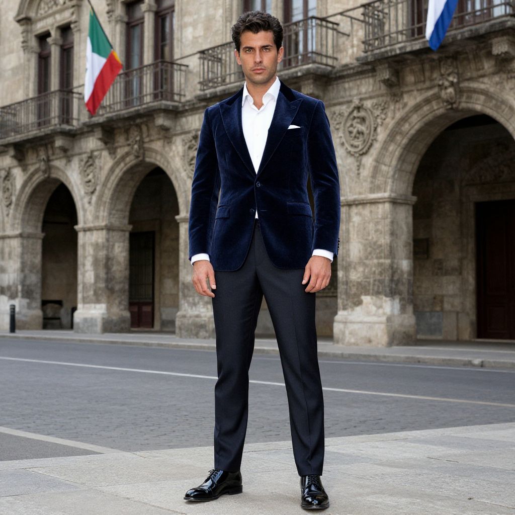 A man, luxury navy velvet sports jacket, crisp white dress shirt, tailored charcoal dress pants, polished black leather oxford shoes, historic stone archways, intricate carvings, flag-draped balconies, lithographic film style, confident expression. Man has masculine face and piercing eyes