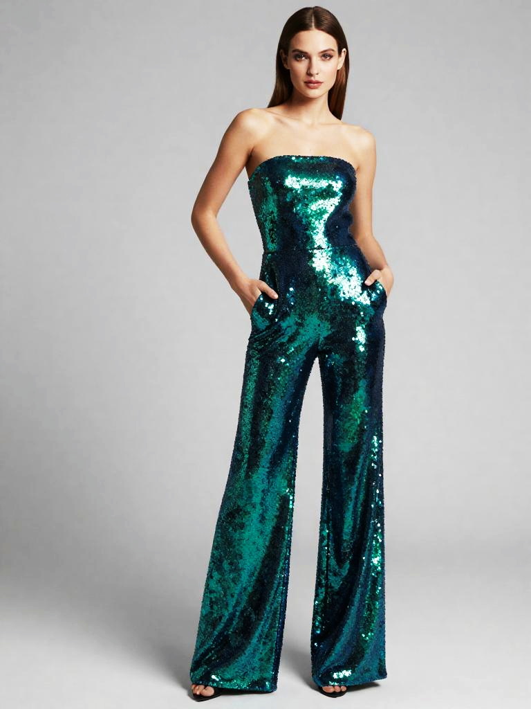 Sequin Jumpsuit, full-body studio fashion photo of pale-skinned woman with straight chestnut hair and soft glam makeup wearing a strapless wide-leg sequin jumpsuit in emerald and sapphire jewel-tone sequins, hands casually in the pockets, weight shifted onto one hip, standing against a clean light grey studio background, soft even lighting, high-end lookbook style