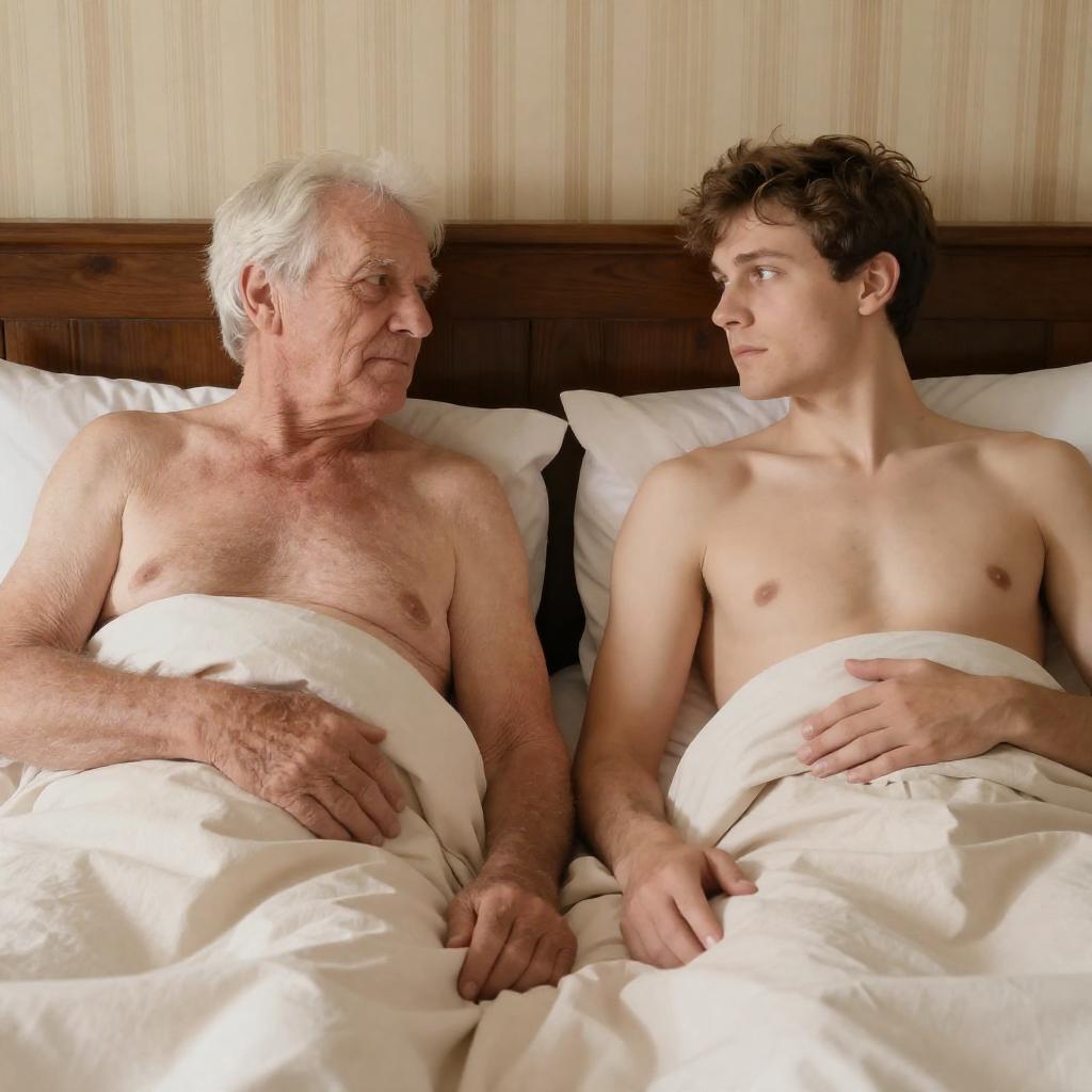 Photograph of an elderly man and a young man in bed. Elderly man with white hair, bare chest, covered with beige blanket, left arm resting on stomach, looking at young man. Young man with short brown hair, bare chest, covered with beige blanket, right hand on stomach, looking at elderly man. Striped yellow, brown, and white wallpaper background. Dark wooden headboard. Both men have neutral facial expressions. Two white pillows. Bed covers partially cover their lower bodies.