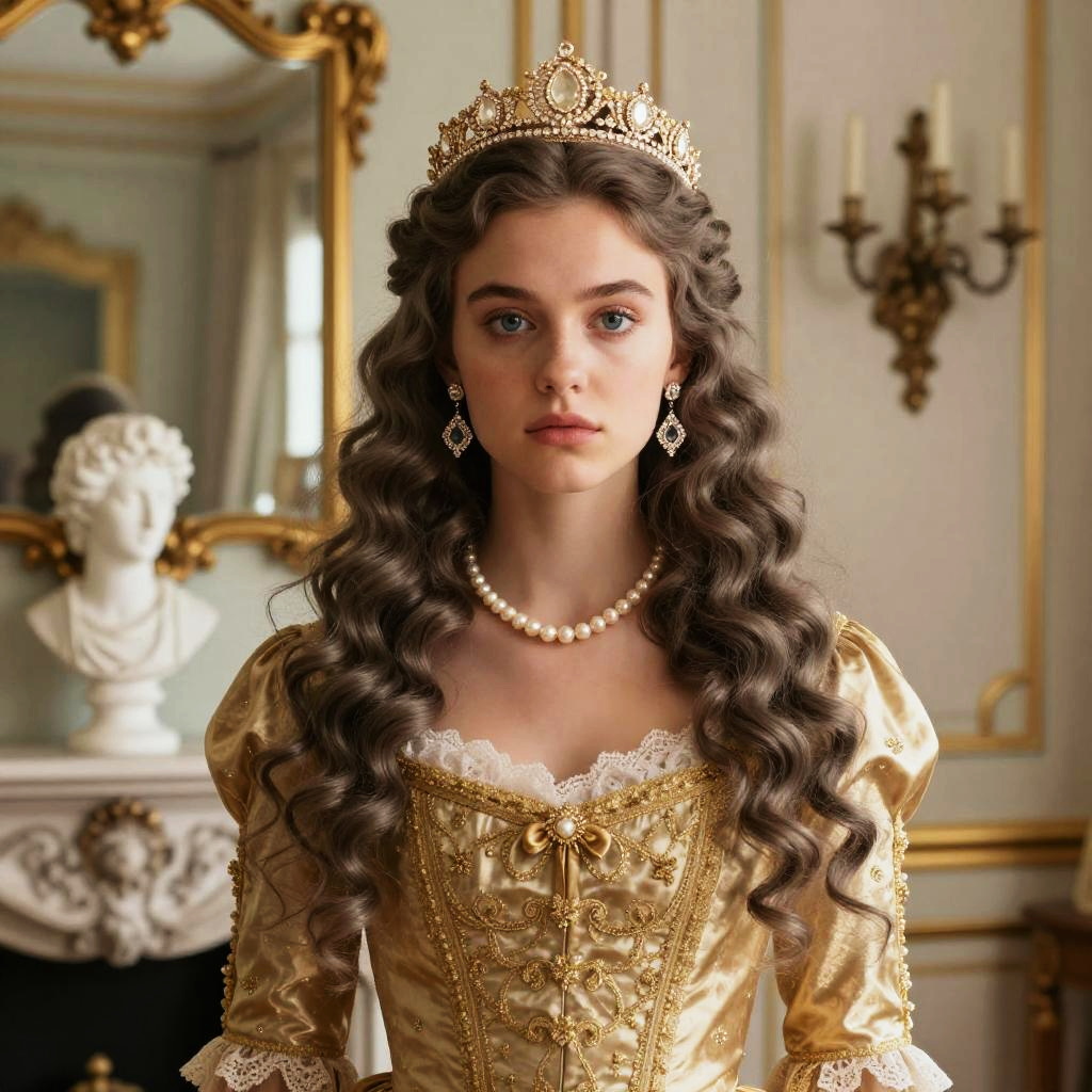 Photograph of a young woman with fair skin and blue eyes, wearing a golden, ornate dress with white lace trim, a pearl necklace, and a gold crown with intricate designs. She has wavy, dark brown hair. The background features an opulent room with a white marble bust, gold-framed mirror, and an ornate wall sconce with lit candles. The lighting is warm, highlighting the luxurious textures and details of her attire and the elegant surroundings. The style is reminiscent of a royal or historical portrait.