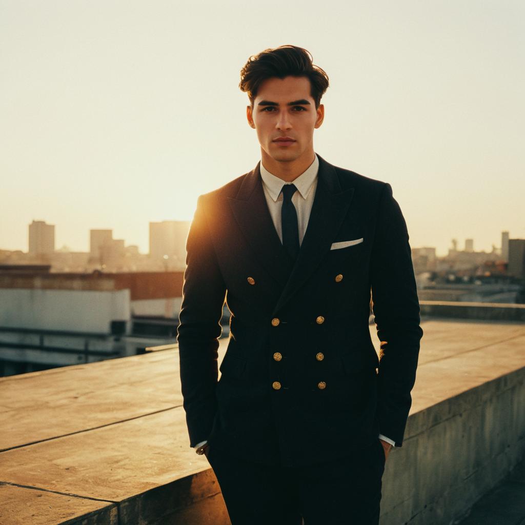 High fashion portrait of young male model wearing a minimalist black tailored double-breasted blazer with slim pants in a modern concrete rooftop on a seamless white background. --sref 1390