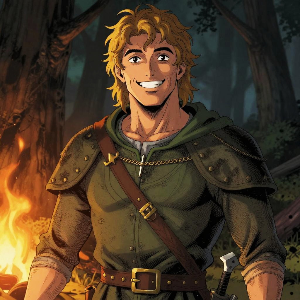 Comic artwork of medieval bard, portrait, smiling, happy, forest background, firelit warm glow, crosshatching, 2D, Sharp, Detailed, HD, HDR, High Quality, High Resolution, Masterpiece