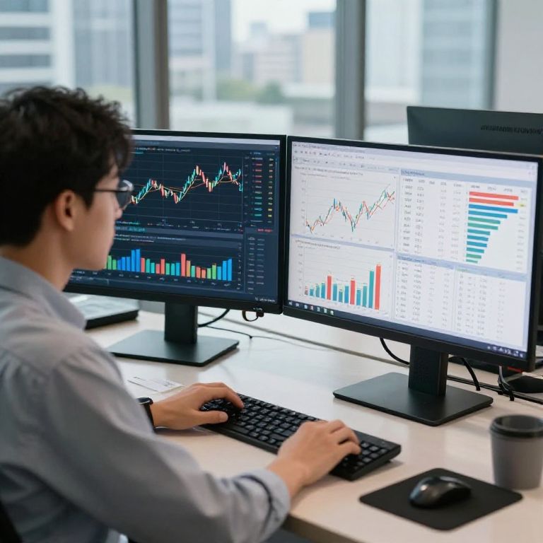 A well-lit image of a financial analyst reviewing complex finance business graphs on multiple monitors, with a cityscape visible through a window behind them.