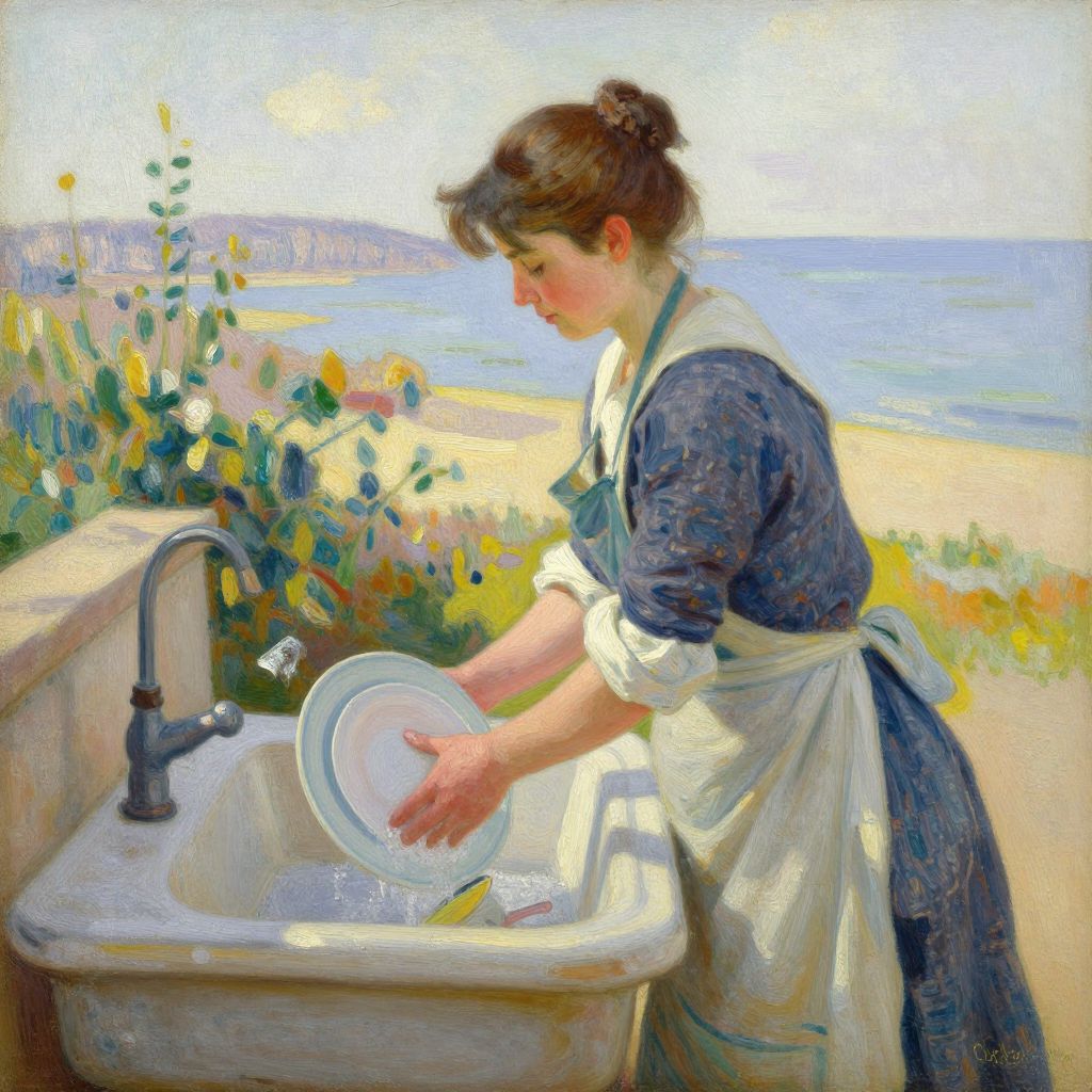 Woman Washing Dishes by the Coast in Impressionist Style