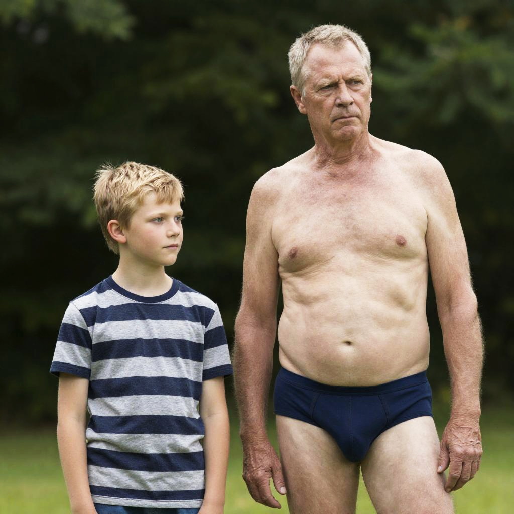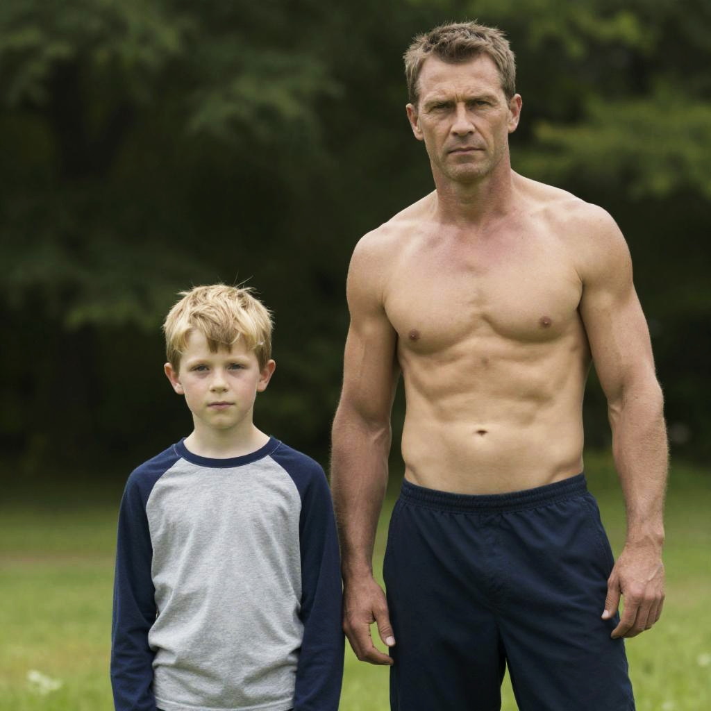 Photograph of two boys playing volleyball near a turquoise pool. The older boy, muscular with short brown hair, wears navy blue briefs and reaches forward with his right arm. The younger boy, with blonde hair, wears a white and blue volleyball shirt and raises his right arm. Grass lawn in the background. Both boys have intense facial expressions. The older boy's face shows determination, while the younger boy's face shows focus.